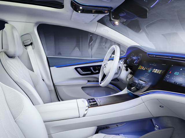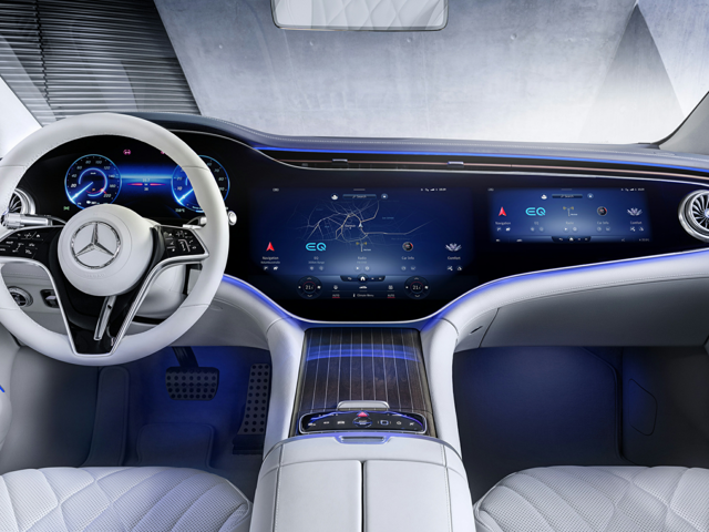 - EQS 580: Optional MBUX Hyperscreen with three displays under a single 56-inch curved glass surface: